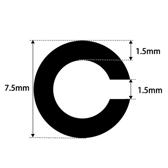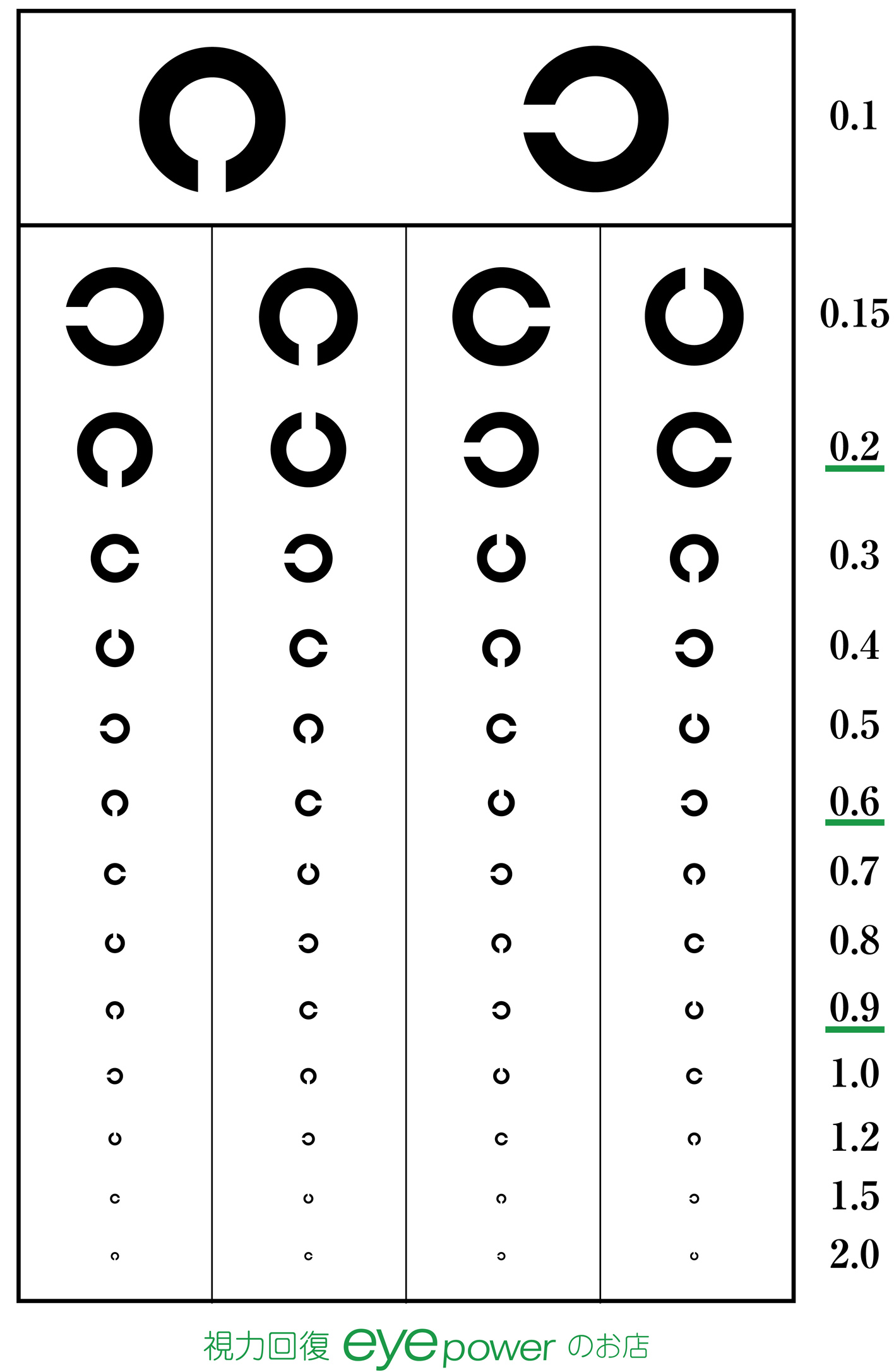 一般的な視力検査には、Cの形をしたランドルト環を使います。外直径7.5ミリメートル、太さ1.5ミリメートルの円の一部に、1.5ミリメートルの隙間を作った形が基本で、これが5メートル離れたところから見える視力が1.0です。同じランドルト環を、半分の距離に近づいてやっと見える視力は0.5です。