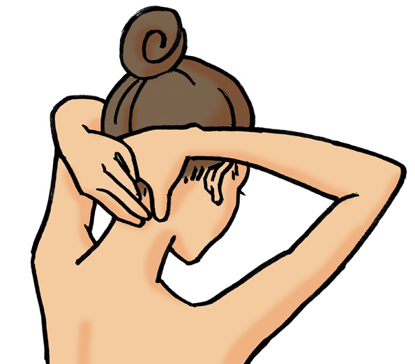 うなじがこったときは、首の後ろの2本の太い筋肉(僧帽筋=そうぼうきん)をつまむようにしてもむ。