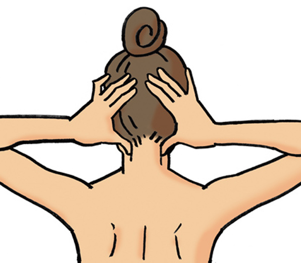 首の後ろのツボを指圧するときは、ひじを左右に張り出して、両手で頭をかかえるようにして親指でツボを押す。
